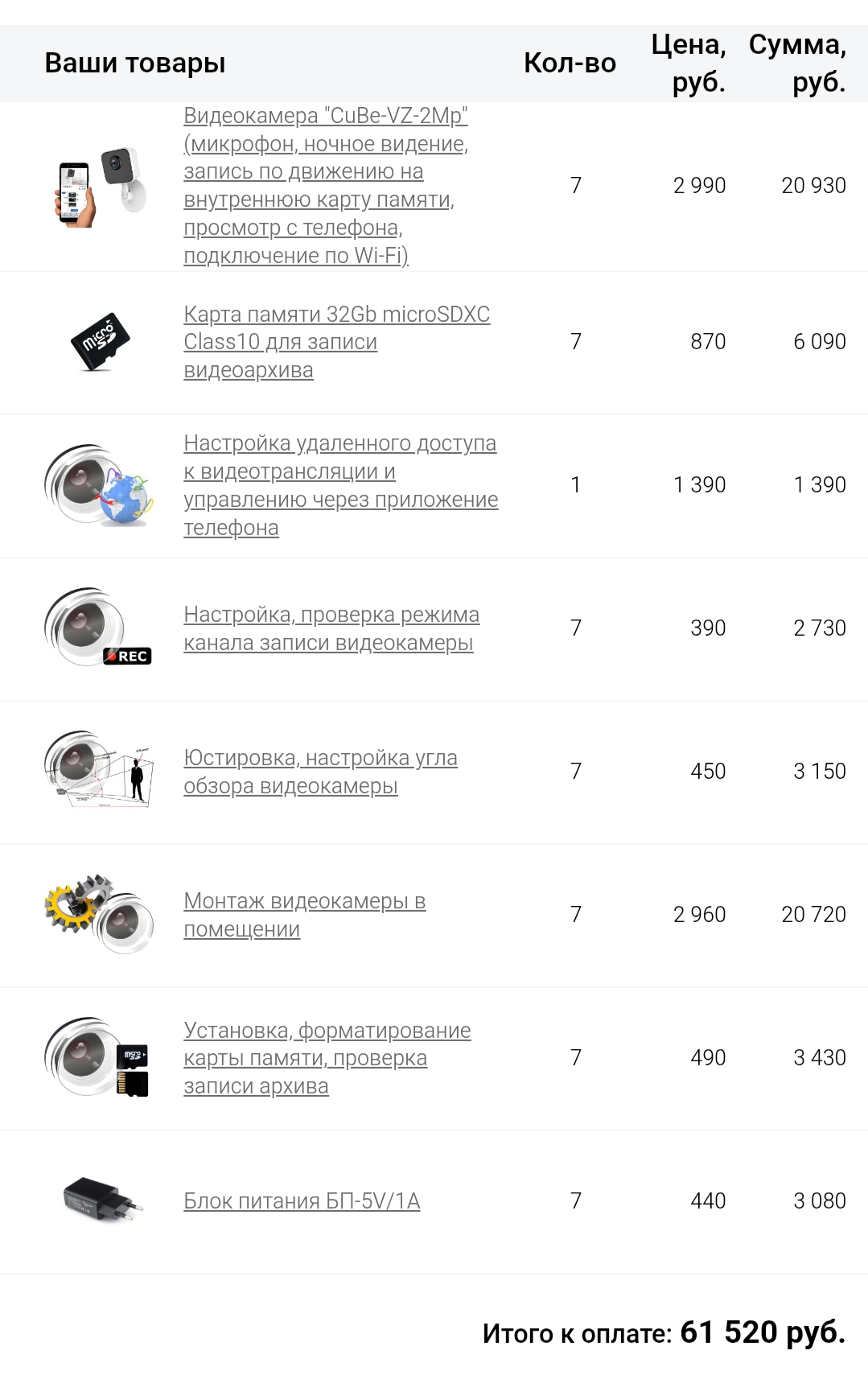 Комплект на 7 видеокамер с микрофоном, запись со звуком по детектору движения на внутреннюю карту памяти, удаленное управление с телефона, просмотр происходящего в реальном времени, а также видеархива записей. В стоимость включено: семь видеокамер, семь карт памяти 32Gb, выезд мастера, доставка, настройка, монтаж и подключение. Количество дополнительного кабеля, оборудования (не входящего в комплект) и материалов для установки расчитывается индивидуально.