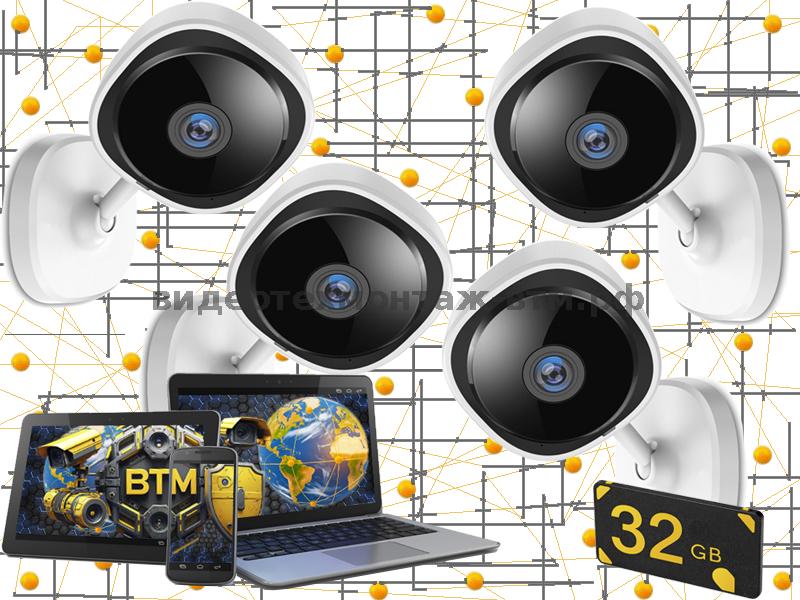Комплект на 4 видеокамеры "BTM-CuBe-4-VZ-IP-32Gb" с учетом установки (микрофон, ночное видение, запись по движению на внутренние карты памяти, просмотр с телефона)