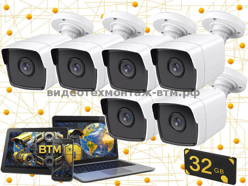 Комплект на 6 видеокамер "BTM-CiliNDR-6-VZ-IP-32Gb" с учетом установки (микрофон, ночное видение, запись по движению на внутренние карты памяти, просмотр с телефона)