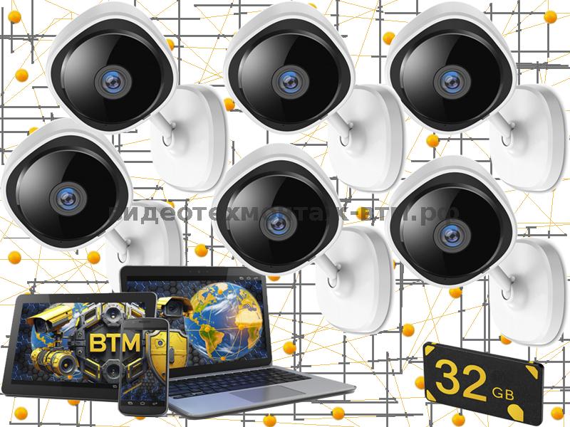 Комплект на 6 видеокамер "BTM-CuBe-6-VZ-IP-32Gb" с учетом установки (микрофон, ночное видение, запись по движению на внутренние карты памяти, просмотр с телефона)