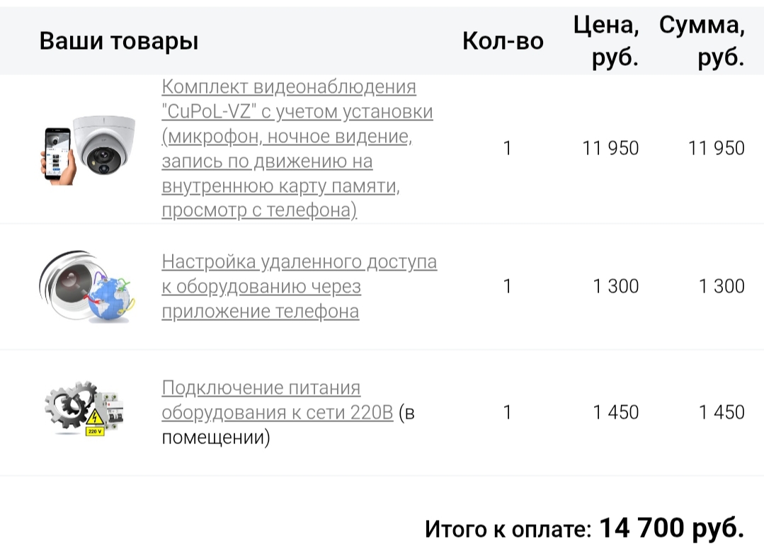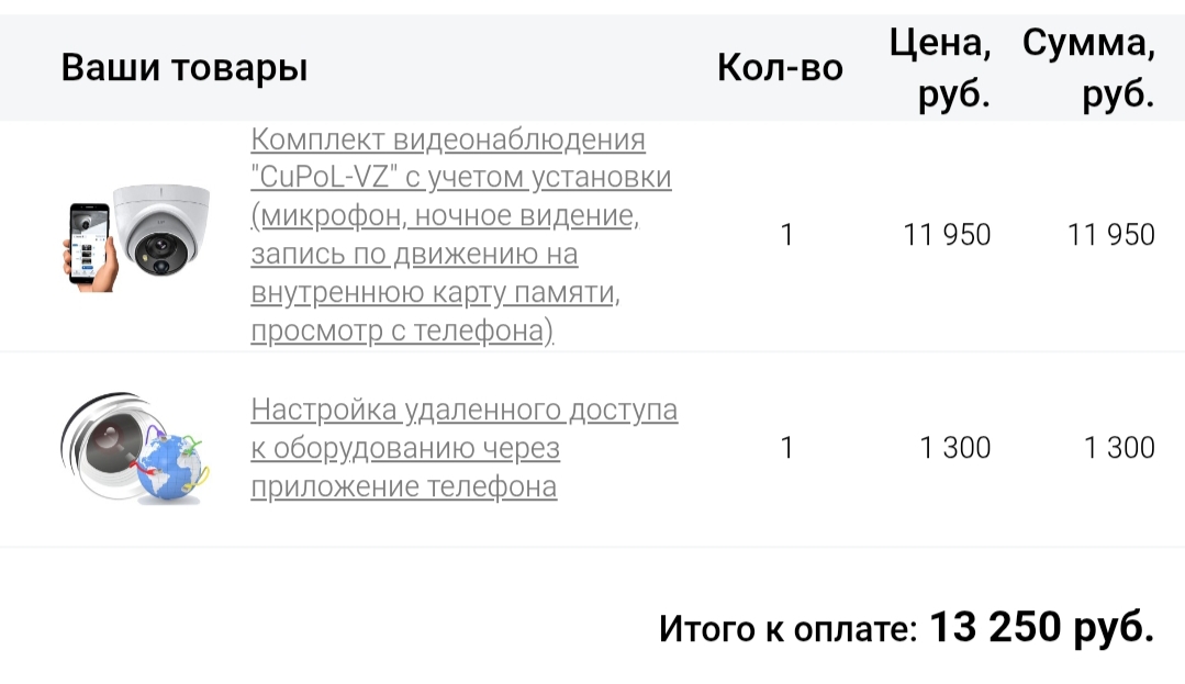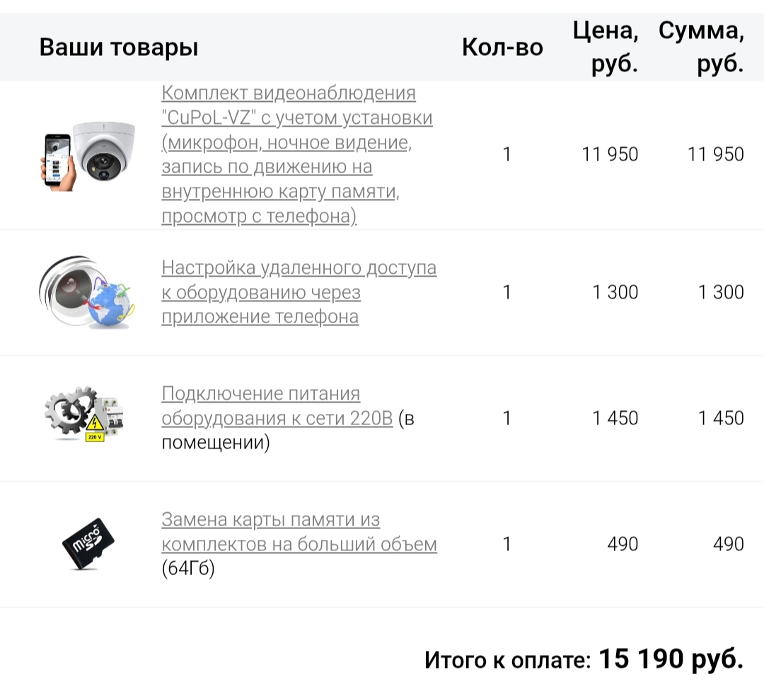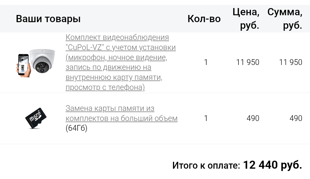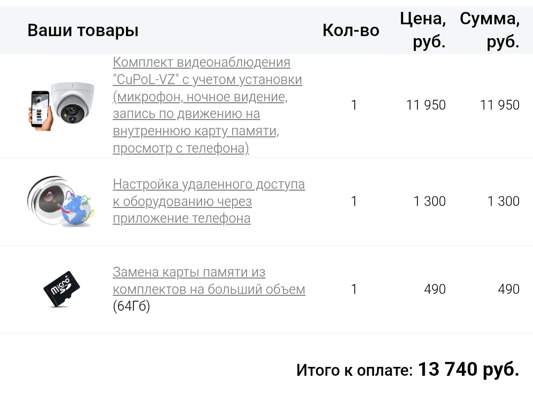 Комплект на 1 видеокамеру с микрофоном, запись со звуком по детектору движения на внутреннюю карту памяти, удаленное управление с телефона, просмотр происходящего в реальном времени, а также видеархива записей. В стоимость включено: видеокамера, карта памяти 32Gb, выезд мастера, доставка, настройка, монтаж и подключение.