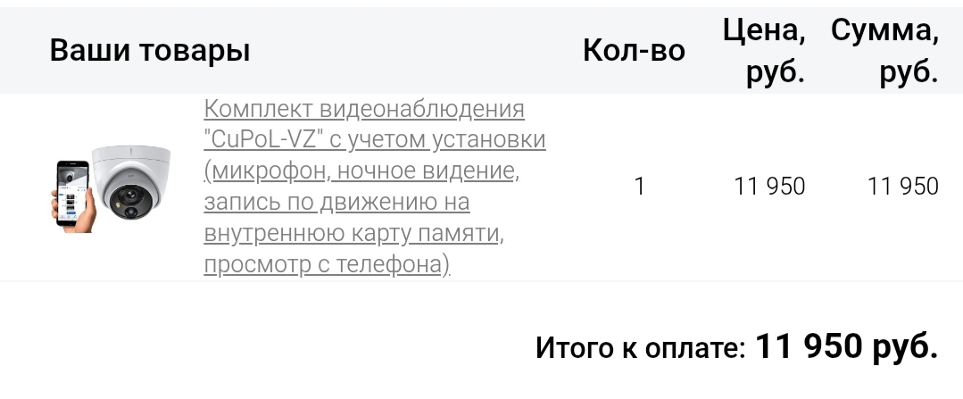 Комплект на 1 видеокамеру "CuPoL-VZ-I" с учетом установки (микрофон, ночное видение, запись по движению на внутреннюю карту памяти, просмотр с телефона)