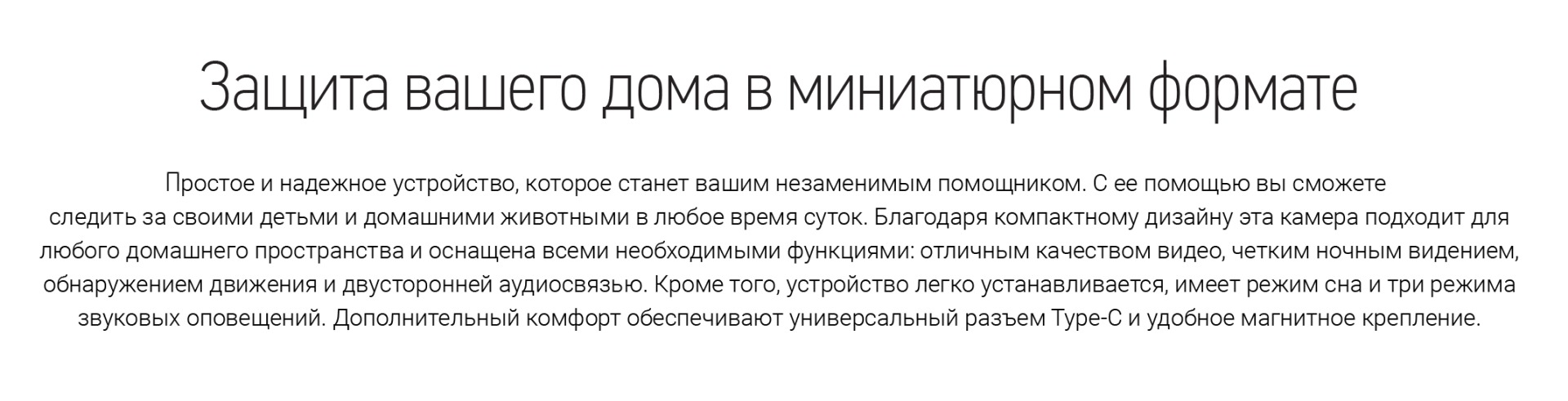 Камера представляет собой решение с балансом между технической простотой и функциональной насыщенностью. Она идеально вписывается в сценарии, где требуется мониторинг внутреннего пространства без громоздкой установки и сложной настройки: например, детская комната, кабинет или зона отдыха.