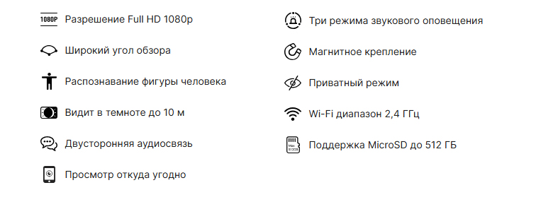 При хранении записей предусмотрен слот microSD с поддержкой карт до 512 ГБ. Габариты корпуса весьма скромные, масса устройства — 87 г. Установка упрощена за счёт магнитного крепления, что позволяет без лишних крепежей разместить камеру на металлической поверхности или настенной панели.