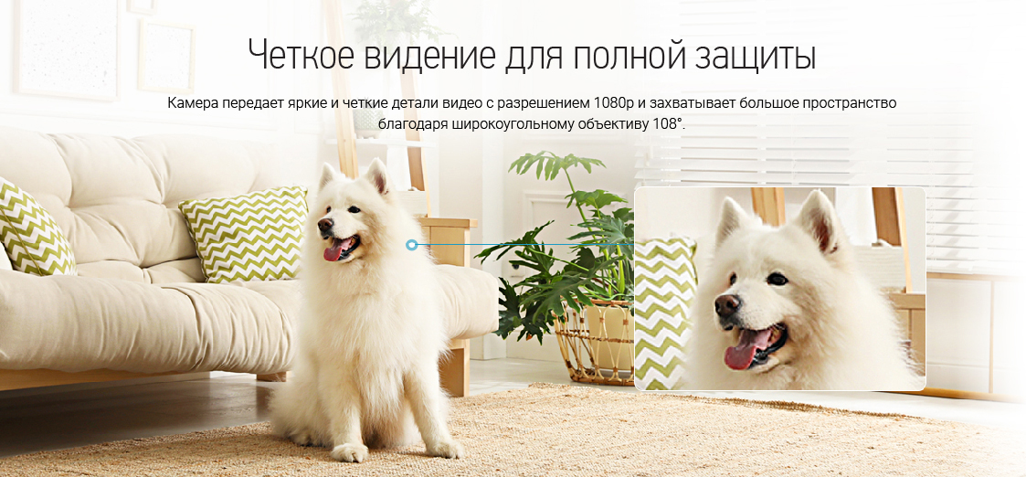 Камера обеспечивает видеосъемку в разрешении 1920×1080 пикселей (Full HD) с максимальной частотой 25 к/с. Оптика с фиксированным фокусным расстоянием 2,8 мм и диагональным углом обзора 108° позволяет охватить большую часть комнаты без необходимости постоянного поворота устройства. В условиях слабого освещения действует ИК подсветка, рабочая дальность до 10 м, минимальная освещённость составляет 0,5 люкс, с подсветкой — 0,1 люкс.
