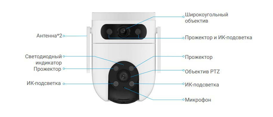 На практике камера заменяет набор из нескольких камер на участке — верхний модуль с широкоугольным объективом фиксирует сцену целиком, нижний телеобъектив обеспечивает приближение и автотрекинг — сочетание уменьшает потребность в нескольких точечных камерах при проектировании наружной системы наблюдения.